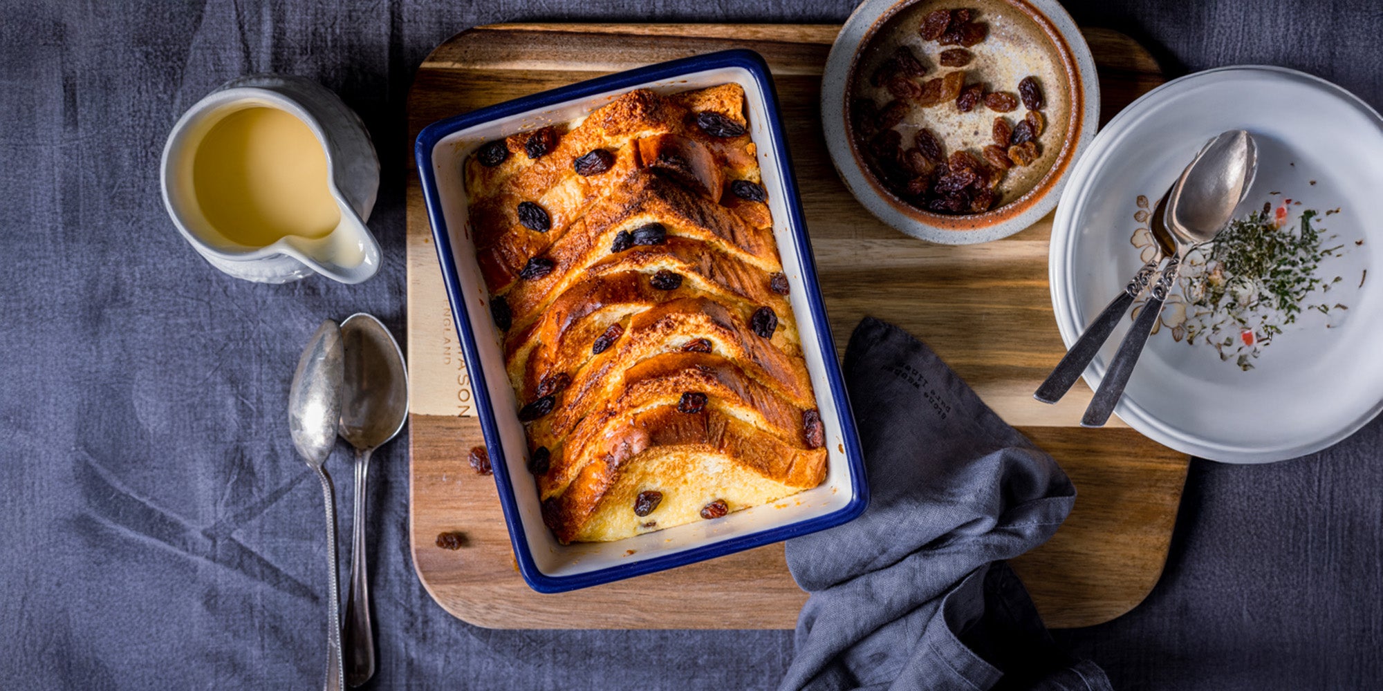 - Arrange half the bread in the base of the dish, overlapping each other. Sprinkle the sultanas and pour half the prepared custard.