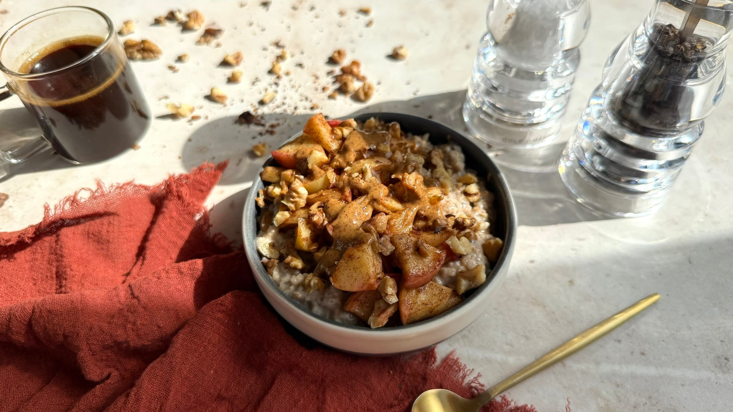 - Spoon your porridge into a bowl and top with the warm caramelised apples, toasted walnuts and almond butter.