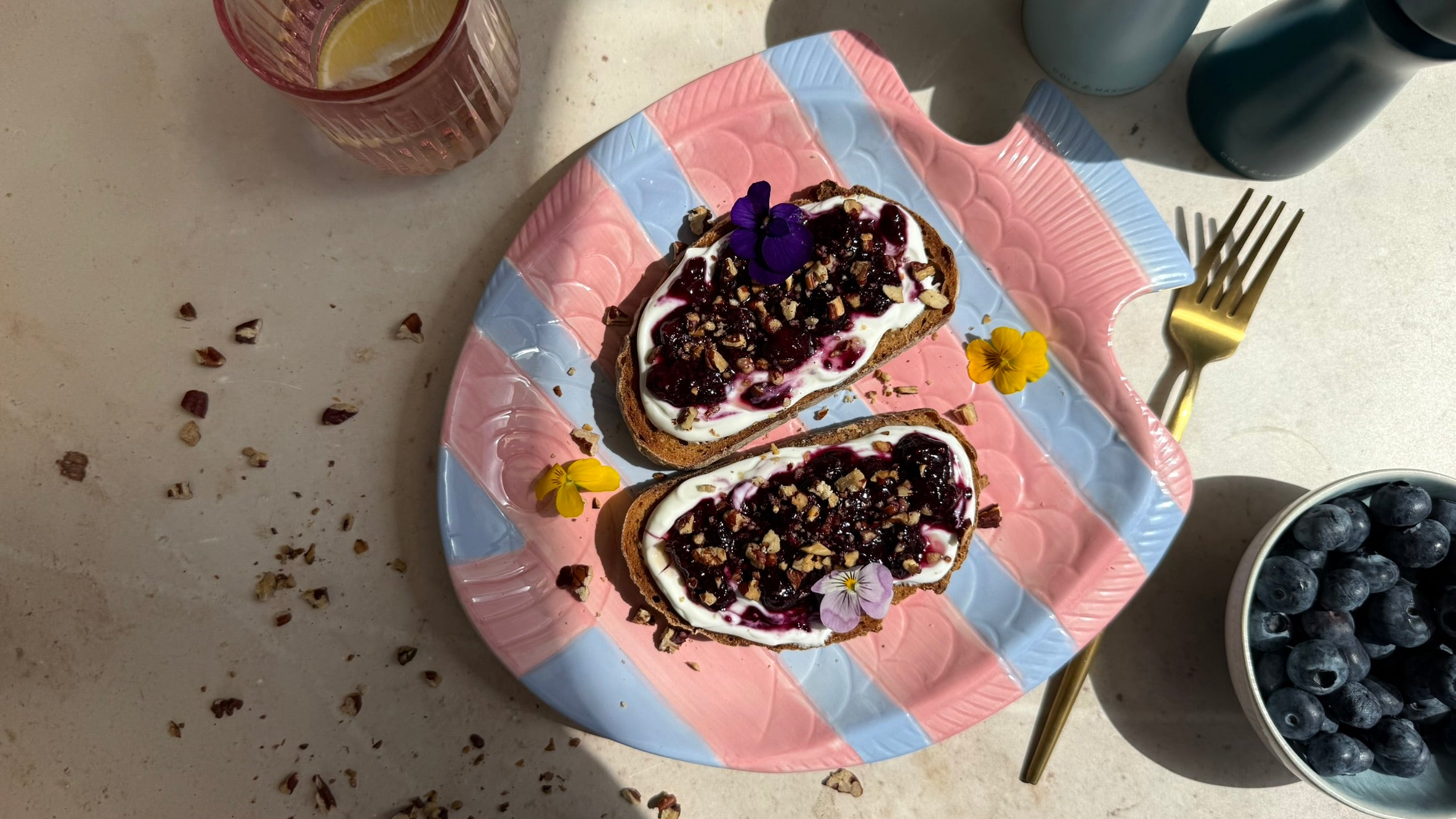 I’ve swapped out the traditional spreads and replaced them with a creamy Greek yoghurt base, offering a light and tangy alternative that pairs perfectly with the juicy blueberries. The honey adds natural sweetness, whilst the toasted pecans add warmth, crunch and a nutty depth. The final sprinkle of salt ties it all together, enhancing every flavour.