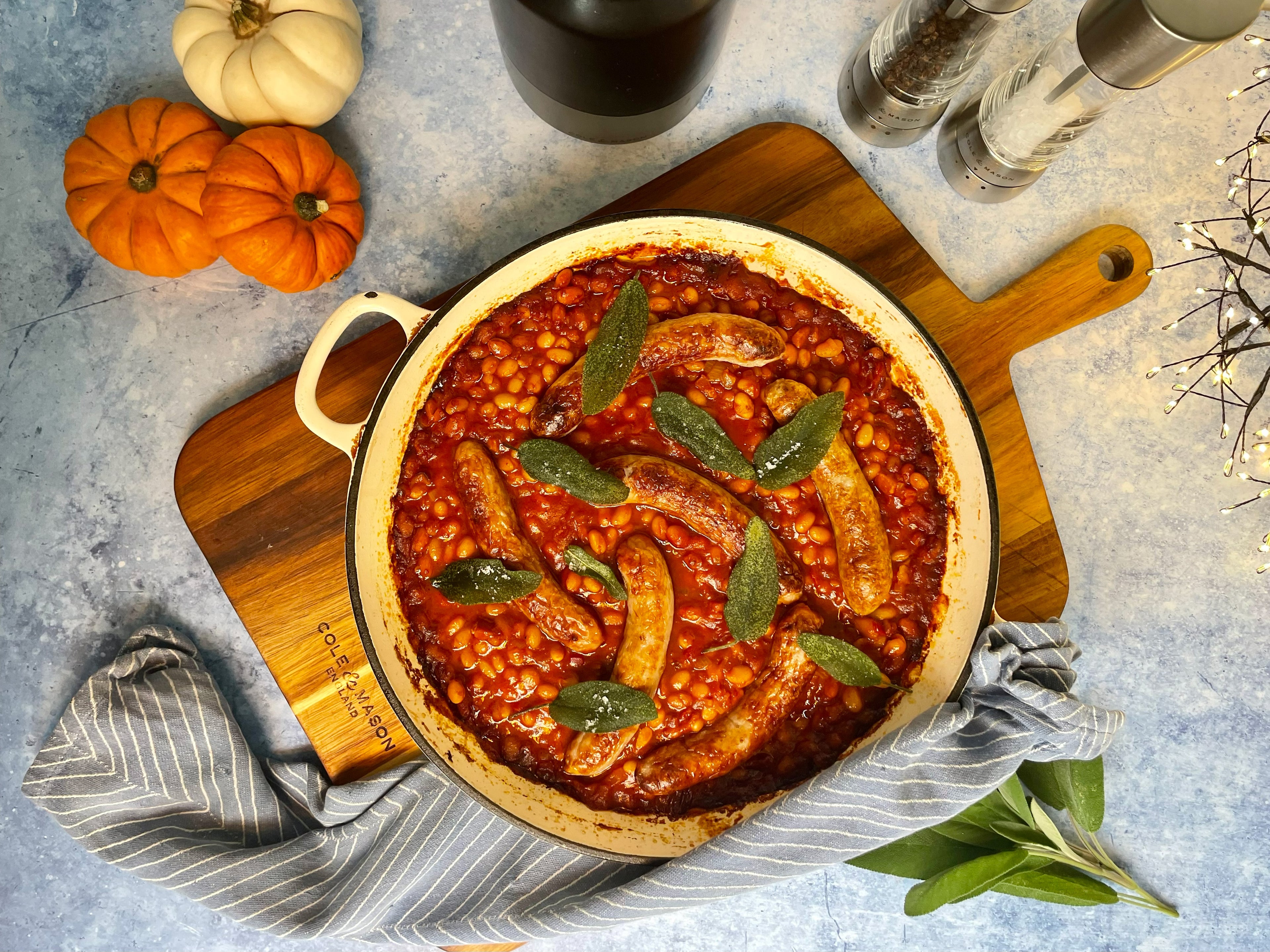 - Arrange the sausages on top of the beans for the final 10 minutes in the oven