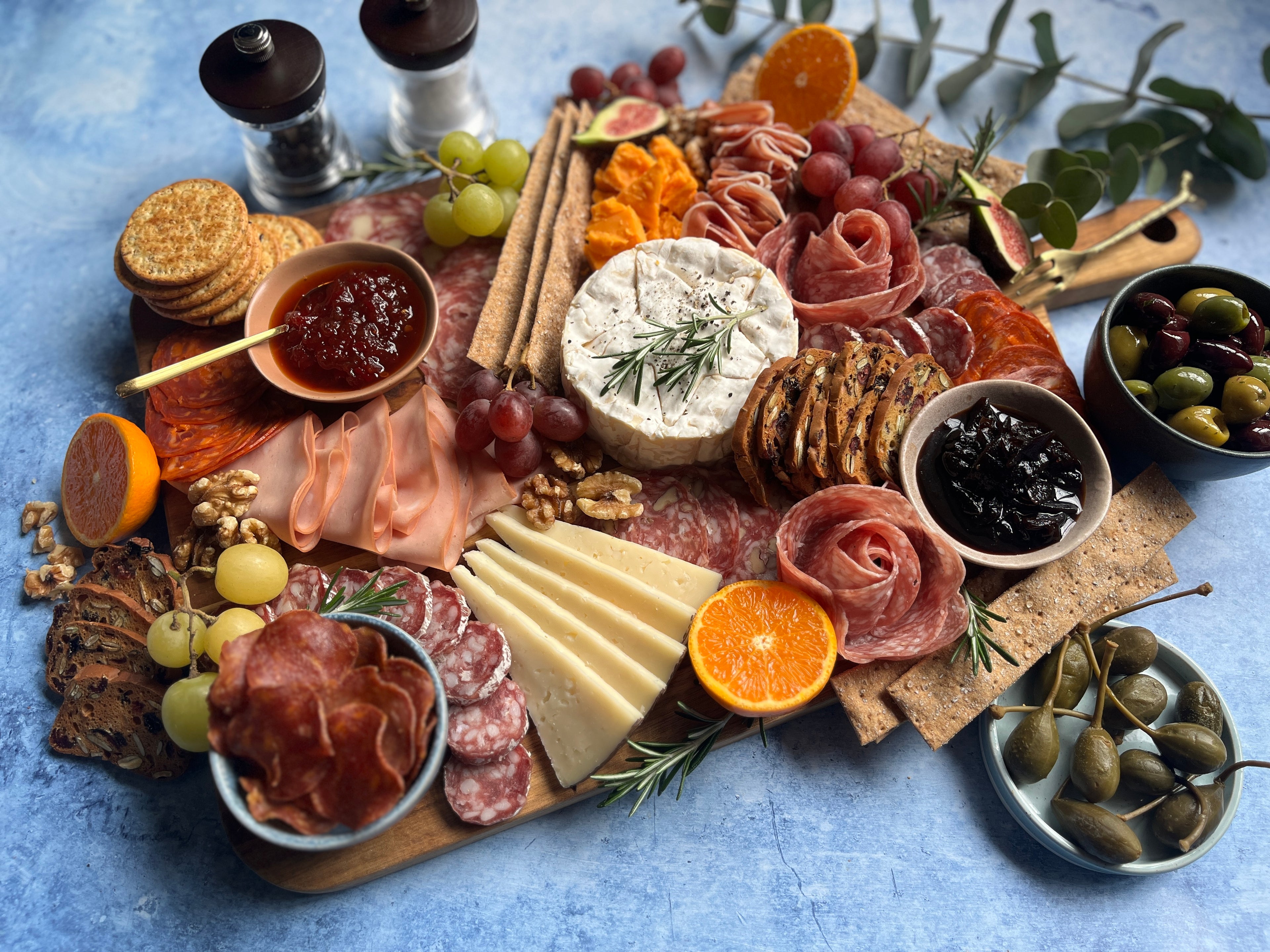 The beauty of this sort of pick and mix selection of deli meats, cheeses, fruits, pickles and crackers is that it can be any size you like and serve just a few people or a large crowd.