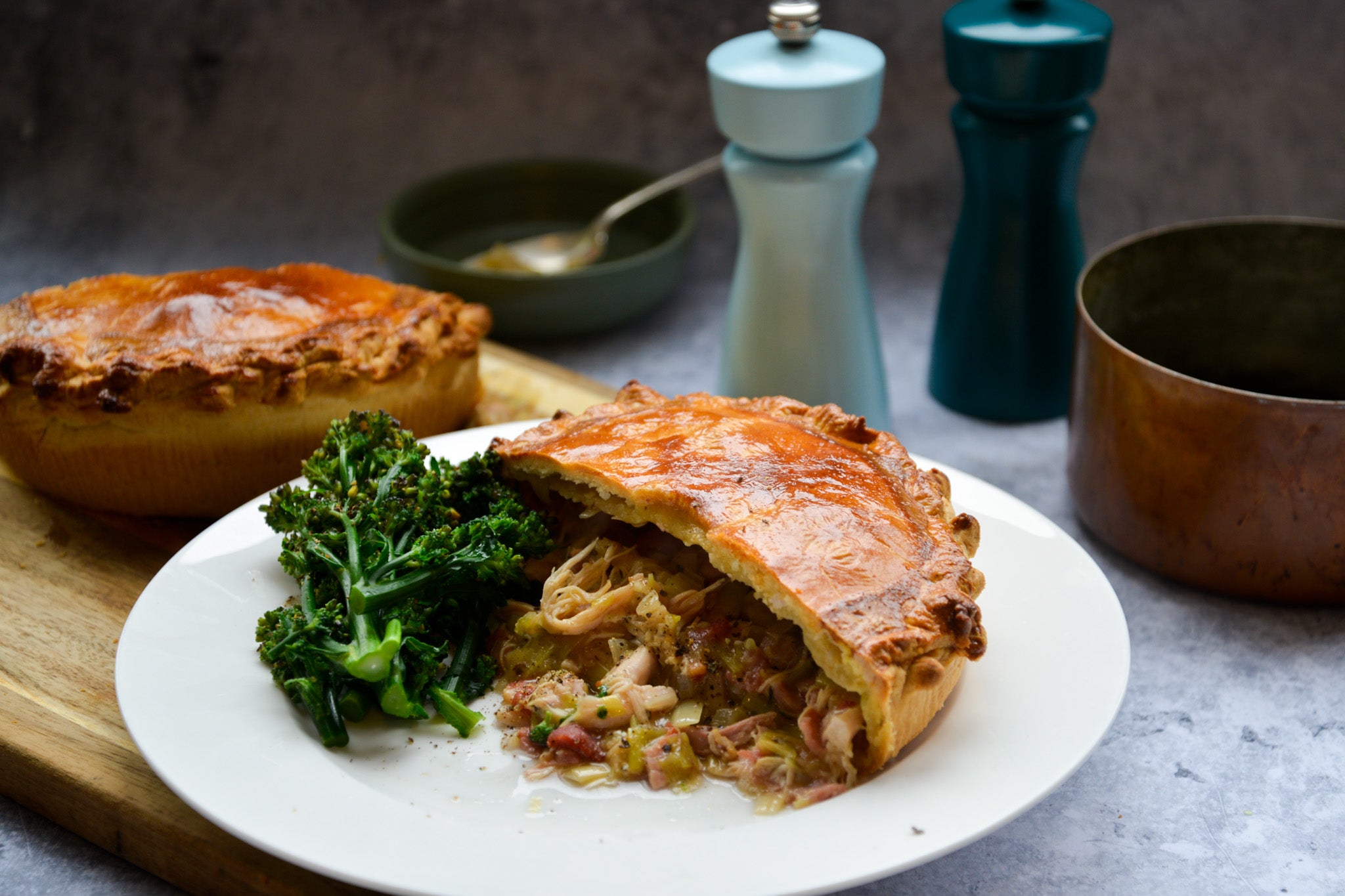 - Line an 18cm pie dish with the short-crust pastry and trim the edges. Mould the trim into a ball and roll out to create a lid - keep in the fridge until you are ready to use.