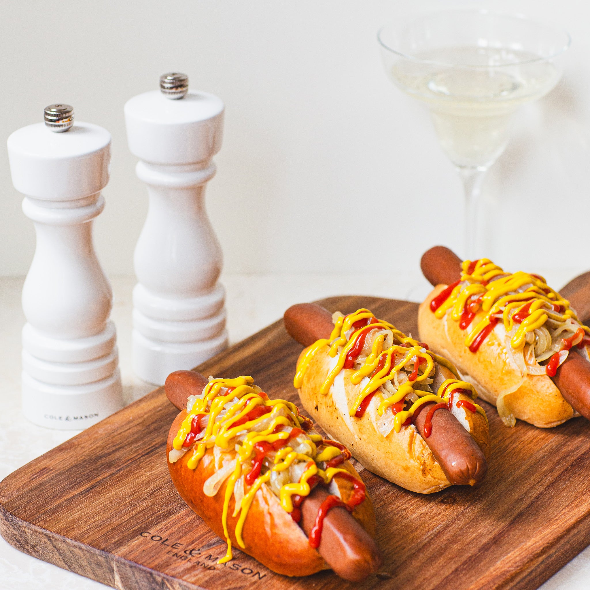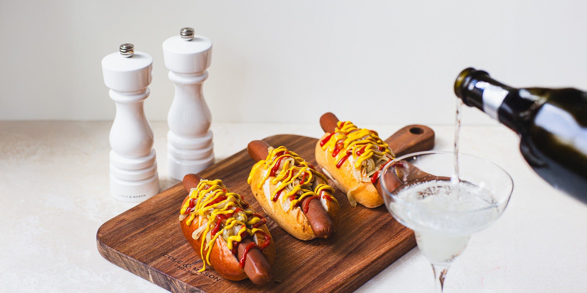 To celebrate the London Eye’s grand opening in 1999, I’ve created this indulgent hot dog recipe. Street food stalls – selling everything from ice cream and popcorn to hot dogs – line the Southbank where the Eye lives. This recipe brings a touch of celebratory sparkle to a humble street food classic by pairing juicy frankfurters with rich, champagne-caramelised onions made piquant with the addition of freshly ground black pepper. Use any dry sparkling wine if you don’t have champagne — just don’t skip it.