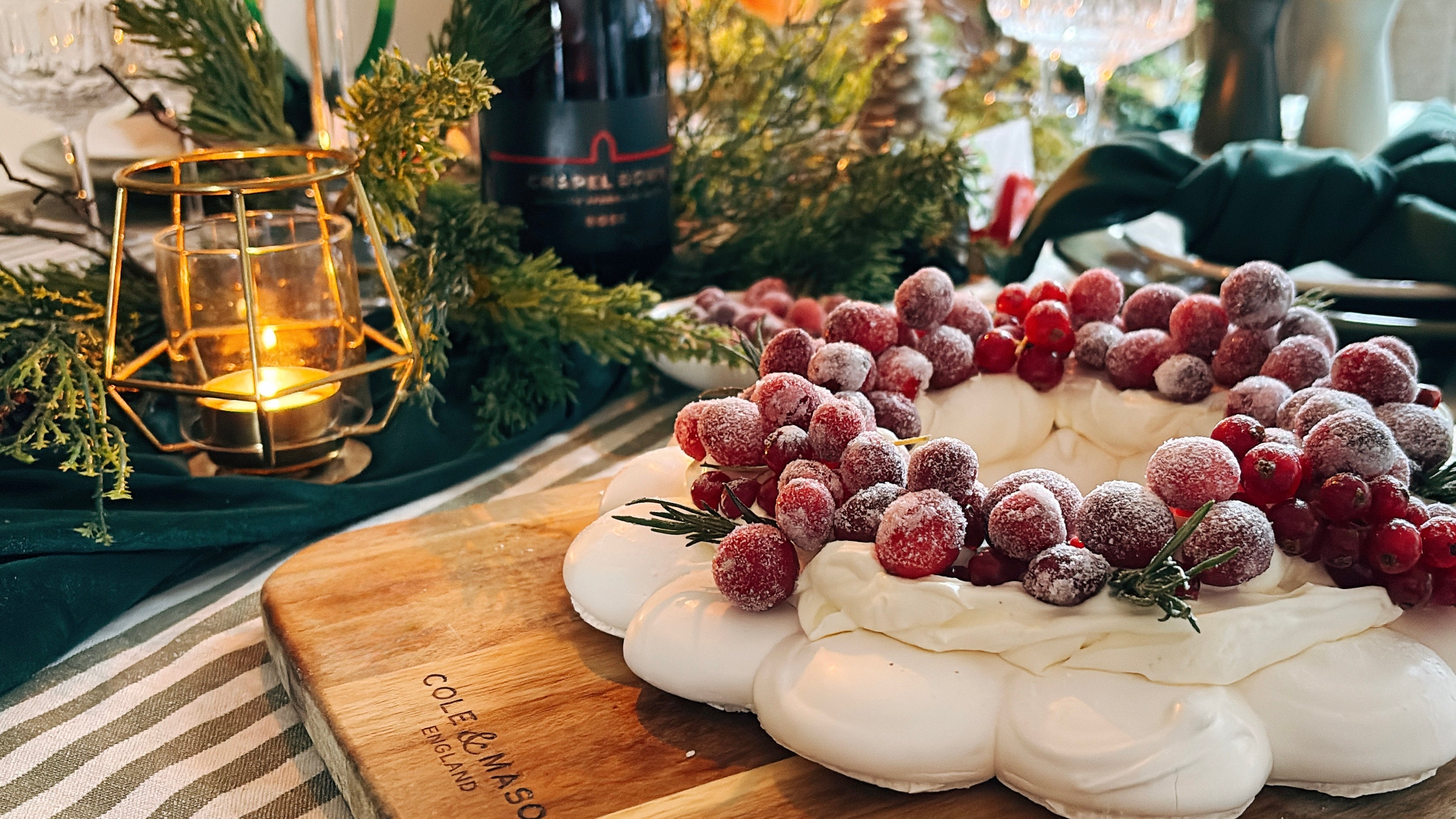 - To decorate and serve. Place the meringue on your serving board, top with the Chantilly cream and decorate with the sugared cranberries. I have added some rosemary sprigs in contrast and some more red fruit to please all guests.