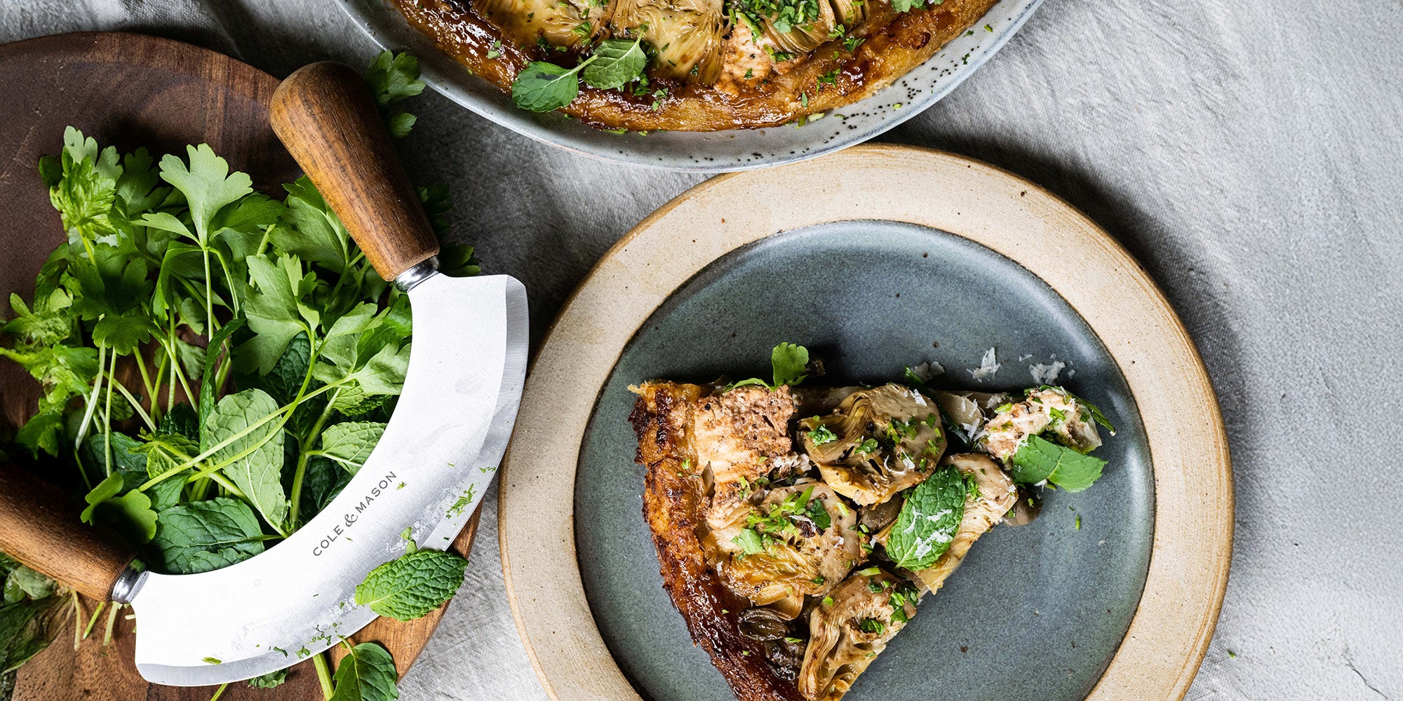 This is a simple but striking tart that transforms two of my favourite deli products, baby artichokes and salted capers into something spectacular. The halved baby artichokes are laid in concentric circles on top of a little sea salt and generous turn of freshly cracked black pepper, aged balsamic, lemon zest, mint, garlic, capers and olive oil which all caramelise together beautifully in the oven. This is topped with blobs of fresh ricotta and a sheet of puff pastry. Once baked and caramelised the tart is flipped and finished with extra mint, parsley and parmesan.