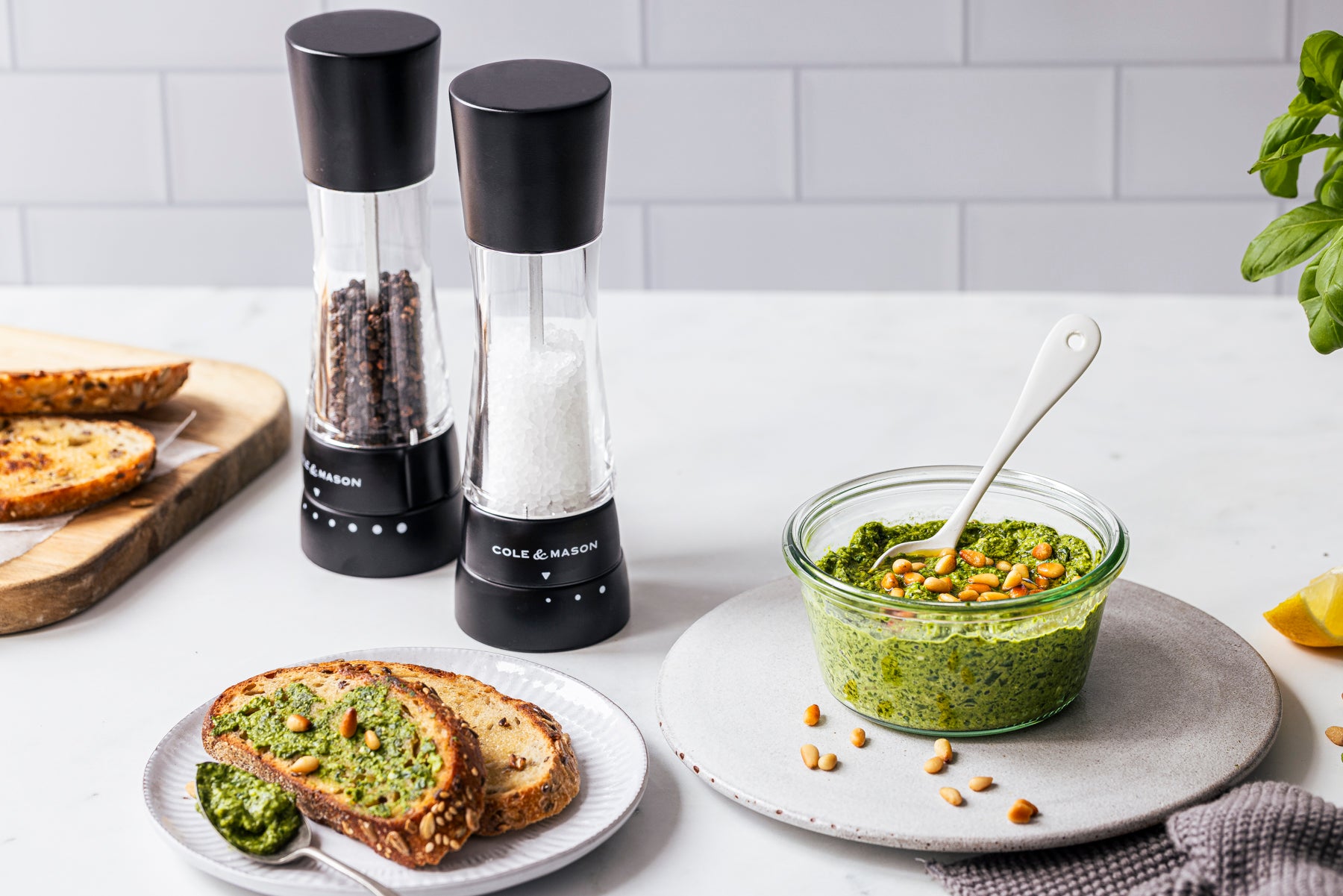 I blend fresh wild garlic leaves with a little basil, toasted pine nuts, Parmesan, and olive oil until it’s lightly textured. A squeeze of lemon and plenty of freshly ground salt and pepper from the Matt Black Derwent Mills makes all the difference.